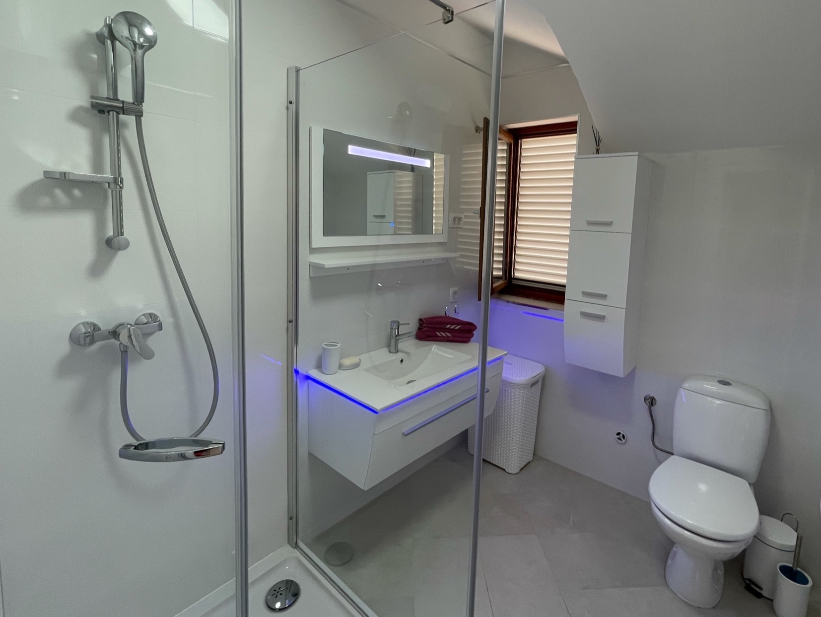 Das geräumige Badezimmer verfügt über eine Dusche, ein Waschbecken mit Schränken sowie über eine Toilette. Hier findet ihr genug Platz für alle Utensilien.